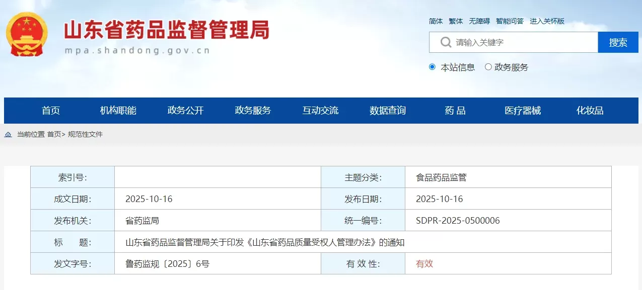 山东省药品监督管理局关于印发《山东省药品质量受权人管理办法》的通知鲁药监规〔2025〕6号 省局有关处室、各检查分局,相关直属单位: 《山东省药品质量受权人管理办法》已经省局党组会研究通过,现印发给你们,请认真遵照执行。 山东省药品监督管理局 2025年10月16日 (公开属性:主动公开) 山东省药品质量受权人管理办法第一章 总则第一条 为加强和规范全省药品质量受权人(以下简称“受权人”)的管理,确保药品安全、有效和质量可控,根据《中华人民共和国药品管理法》《中华人民共和国疫苗管理法》《药品生产监督管理办法》等规定,结合我省实际情况,制定本办法。 第二条 山东省行政区域内的药品上市许可持有人(以下简称“持有人”)、药品生产企业实施受权人制度及其监督管理活动,适用本办法。 第三条 受权人制度是持有人和药品生产企业授权特定的质量管理人员对其药品生产和质量活动进行管理,对药品生产活动是否符合法律法规和药品生产质量管理规范进行内部审核,由其批准药品放行并承担相应责任的制度。 第四条 受权人是指具有相应专业技术资格和工作经验,经企业法定代表人授权,参与企业药品生产和质量活动的管理,并承担产品放行职责的高级管理人员。 第五条 持有人和药品生产企业应当建立本企业的受权人管理制度,为受权人履行职责提供必要的条件,同时确保受权人独立履行职责,不受企业法定代表人、企业负责人和其他人员的干扰。 第六条 持有人和药品生产企业是受权人制度实施的主体,应当建立药品上市放行或出厂放行规程,明确放行的标准、条件。持有人负责药品全生命周期管理,对上市销售的药品质量负主体责任。自行生产和委托生产的持有人,其受权人承担药品上市放行职责;受托生产的企业,其受权人承担药品出厂放行职责。 第七条 省药监局负责对全省受权人制度实施情况进行监督管理,将持有人和药品生产企业实施受权人制度情况作为常规检查和风险评估的重要内容。 第二章 职责要求第八条 受权人应当具备以下条件: (一)全职在岗,具备良好职业操守,具有遵纪守法、坚持原则、诚实守信的工作作风和工作态度。 (二)熟悉、掌握并正确执行国家相关法律法规,正确理解和掌握实施药品生产质量管理规范的有关规定;具有必要的专业理论知识,并经过与产品放行有关的培训。 (三)熟悉药品生产质量管理工作,具备监督、指导企业各部门实施药品生产质量管理规范的专业技能和履行受权人职责的能力,熟悉所负责放行产品的生产工艺和质量标准。 (四)具有药学或者相关专业本科及以上学历或者中级专业技术职称或者执业药师资格,具有五年以上从事药品生产和质量管理的实践经验,从事过药品生产过程控制和质量检验工作。 (五)有能力对药品生产和质量管理中的实际问题作出正确分析、判断和处理,具有良好的组织、沟通和协调能力。 第九条 不同类别持有人或药品生产企业受权人还应当符合《药品生产质量管理规范(2010年修订)》相关附录(如无菌药品、生物制品、血液制品、中药制剂、中药饮片、医用氧、生化药品、放射性药品附录等)以及《国家药监局关于加强药品上市许可持有人委托生产监督管理工作的公告》(2023年第132号)等文件中关于受权人的要求。 第十条 受权人主要职责: (一)参与企业质量体系建立、内部自检、外部质量审计、验证以及药品不良反应报告监测、产品召回等质量管理活动。 (二)承担产品放行职责,确保每批已放行产品的生产、检验均符合相关法律法规、药品注册和质量标准等规定和要求。 (三)在产品放行前,出具产品放行审核记录,并纳入批记录。 (四)参与企业组织的产品质量相关会议,如产品质量分析会议、年度质量回顾分析会议、产品质量风险评估会议等。参与对产品安全性、有效性和质量可控性的系统分析,查找并消除药品质量风险隐患。 第十一条 受权人对所负责放行产品质量有关键影响的以下工作具有充分的知情权: (一)注册批准和上市后变更信息。 (二)持续稳定性考察结果。 (三)纠正和预防措施相关信息。 (四)所有投诉、调查信息。 (五)委托生产和委托检验情况,包括受托生产企业的确定、委托生产协议和质量协议的制定、委托生产中受权人批准放行每批药品的程序等。 (六)召回处理情况。 (七)关键物料使用,不合格品处理;关键物料和服务供应商、关键生产设备的选取;生产、质量、药物警戒、物料、设备和工程等部门的关键岗位人员的选用。 (八)其他对产品质量有关键影响的工作。 第十二条 受权人在药品放行管理过程中,应当主动与企业法定代表人、企业负责人、受(委)托生产企业、相关药品监督管理部门进行交流沟通,具体情形为: (一)在本企业及相关方接受监督检查期间,积极配合检查组开展检查。 (二)确保企业发生的重大质量事故和严重不良事件,按照相关法律法规规定和时限要求及时上报。 (三)定期向企业法定代表人及企业负责人报告药品放行履职工作情况。 (四)督促相关部门履行药品年度报告职责。 (五)确保持有人结合产品风险定期对质量管理、生产管理等情况进行回顾分析,原则上每季度不少于一次风险研判。 (六)其他应当进行沟通和协调的情形。 第十三条 药品上市放行或出厂放行前,受权人应当对每批药品进行质