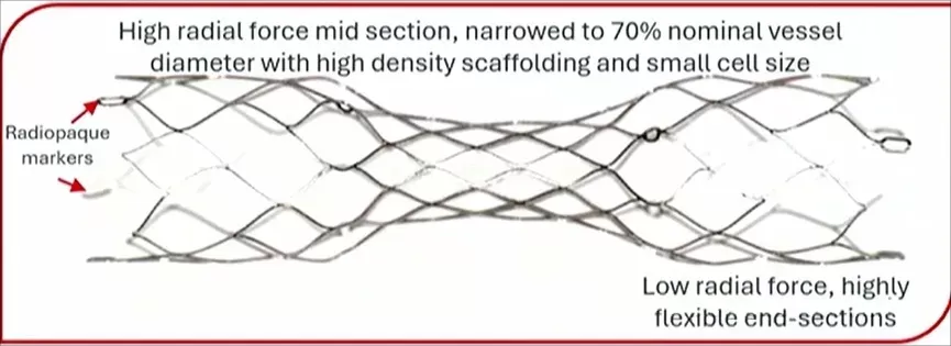 很特别的是,支架释放后,狭窄段扩张至约60%(而不是100%)的非病变血管直径,所以恢复的血流得到控制,这会降低颅内出血风险;